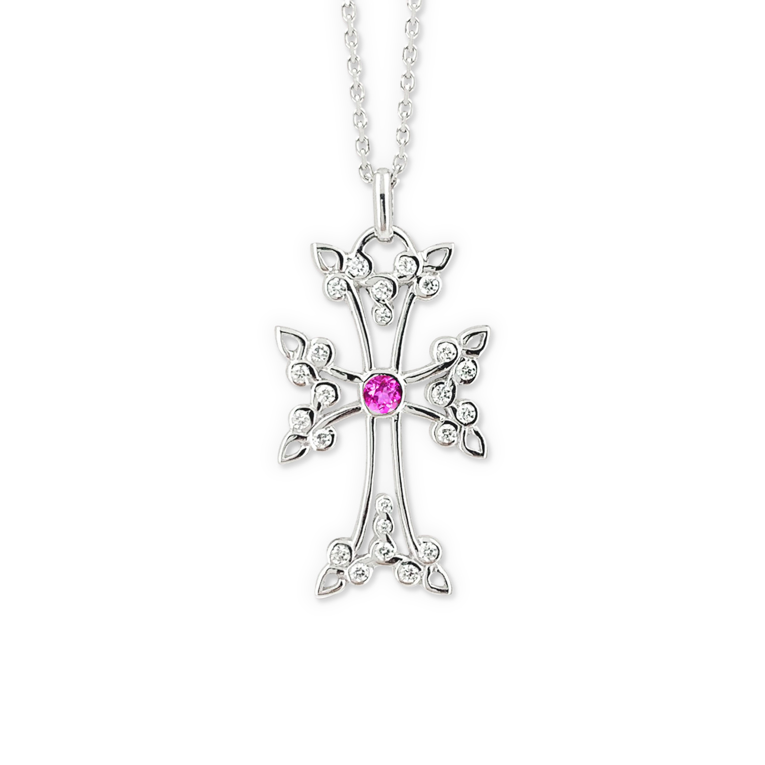 Le pendentif croix Arménienne Anouch est proposé en or blanc, rose ou jaune. Il est serti de diamant, d'un centre diamant et/ou d'une pierre de centre de couleur. Tout en restant discrète, cette pièce offre une touche raffinée grâce à ses extrémités aux boucles entremêlées et sa pierre centrale.